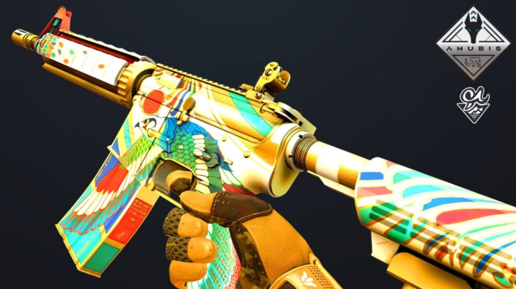 Gold detailing, deep blue enamel patterns, and heavy Egyptian iconography make this one of the cleanest M4A4 finishes in CS2. It pairs especially well with gold stickers or Kato-style holos.