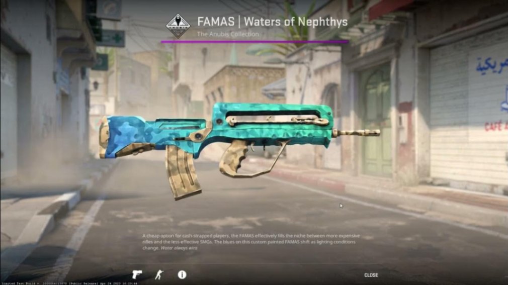 Blue-heavy palette with wave-like flow. One of the more visually distinct FAMAS skins outside classics like Pulse or Roll Cage.